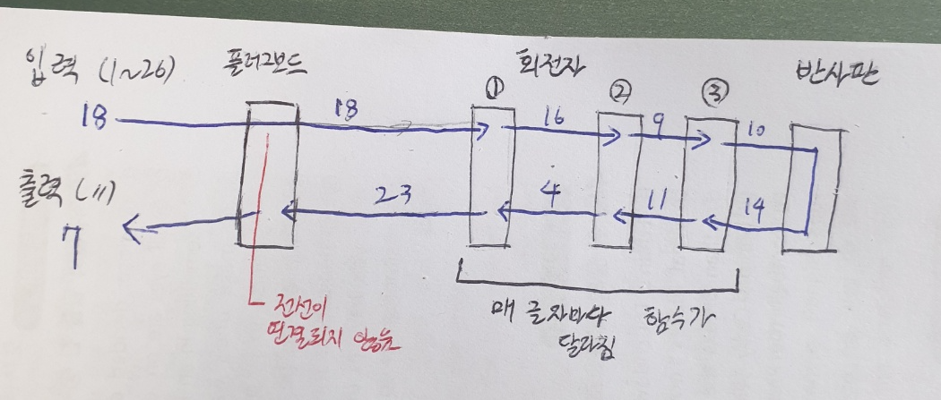 에니그마는 들어온 알파벳을 서로 다른 회전자 3개를 지나면서 암호화한다.