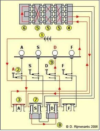 에니그마가 작동하는 모습을 나타낸 그림. 회전자의 특성 덕분에 여러번 같은 글자를 입력해도 매번 다른 글자가 나왔다.
